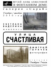 Большая часть этих работ была представлена на выставке "Улица Счастливая" в музее А. Ахматовой. Выставка стала результатом нашей совместной работы с художницей Светланой Баделиной, которая прелесть тихих "хрущёвских" двориков передала живописью. …Хрущёвки - это провинция внутри мегаполиса. Зелёные посадки новосёлов с годами выросли выше домов и заполонили дворы от стены до стены. Рябинки, берёзки, ухоженные клумбочки и даже ягодные кустарники, их не встретишь в Центре. В таких дворах кипит жизнь, почти не чувствуется социальных различий. Дети на великах и роликах. Дамы, выгуливающие не только собачек, но и котов. Бабушки на скамеечках в домашних тапочках и халатах… (С. Баделина)
