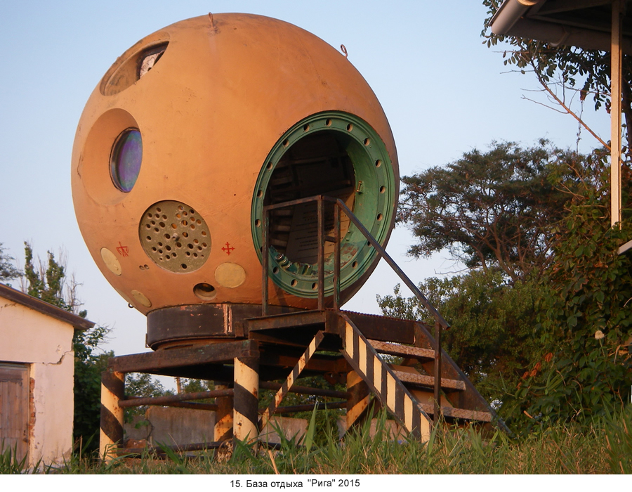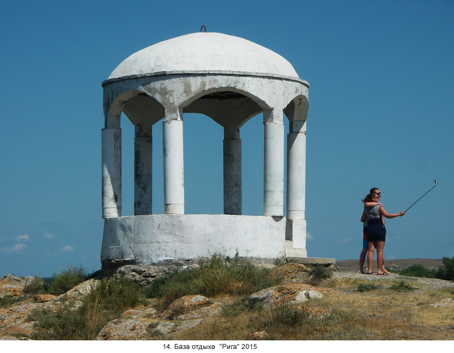 Приморский, в советское время был филиал Центра подготовки космонавтов. Они в нём привыкали к ощущению невесомости, учились есть борщ и макароны по-флотски из тюбиков и доводили до автоматизма действия в штатных и нештатных ситуациях. Работа тяжёлая, иногда их увозили отдыхать в Щёлкино, на БО "Рига". Город, будучи ядерным, был совершенно закрытым, КПП стоял на дороге сразу за Семёновкой. Въезд - только по пропускам, выданным в Москве. Так что космонавты, точнее КГБисты, к ним приставленные, могли отдыхать спокойно: здесь их подопечные были надёжно защищены от всевозможных шпионов. С директором базы они подружились, специально для дорогих гостей на мысу была построена белая беседка, чтоб было как на Южном берегу. (14) Назвали её романтично - беседка Валентины Терешковой. Постепенно она стала символом Щёлкино, единственным, надо сказать; к ней непременно приезжают все свадьбы фотографироваться. Космонавты в долгу не остались и подарили базе капсулу спускаемого аппарата космического корабля. Она до сих пор стоит на берегу, вызывая недоумение сегодняшних постояльцев. (15)
